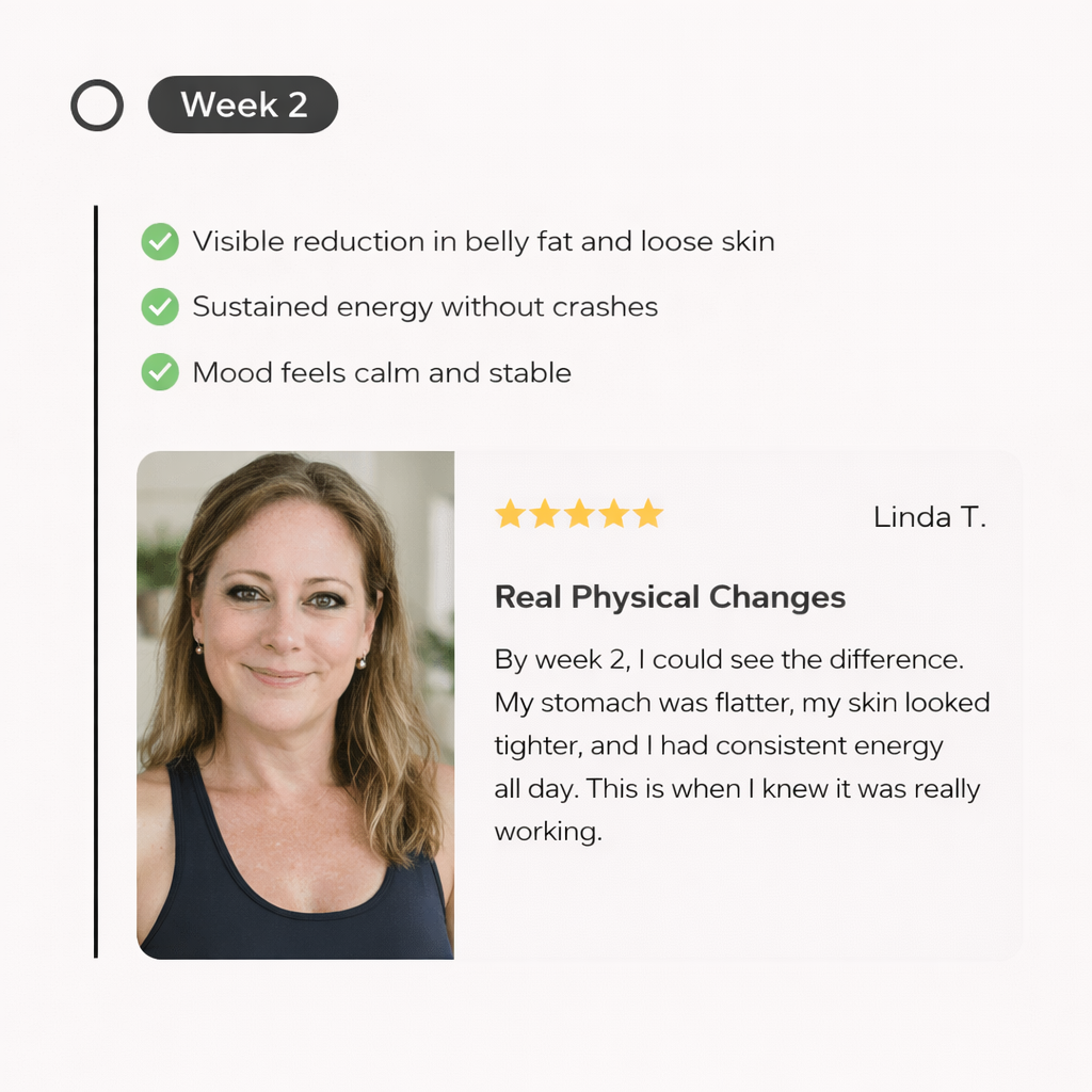 Most women start noticing changes within the first week — better sleep, clearer thinking, and more steady energy. Physical changes like reduced belly fat and tighter skin typically become visible around weeks 2-4. For full, sustained results, we recommend taking it consistently for at least 8 weeks.